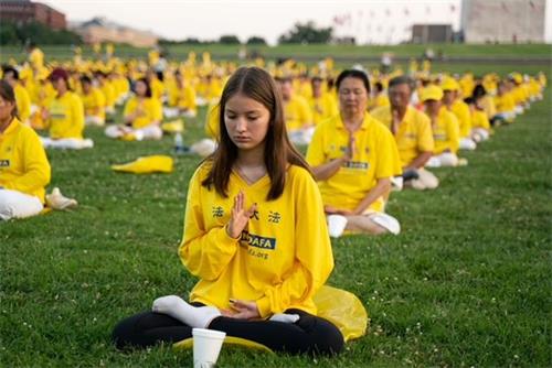 ![]() 图4~5:烛光悼念活动之前,学员们在华盛顿纪念碑前集体炼功。 |