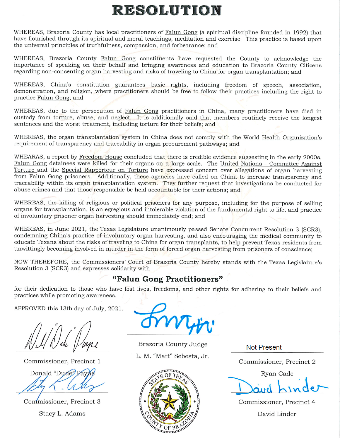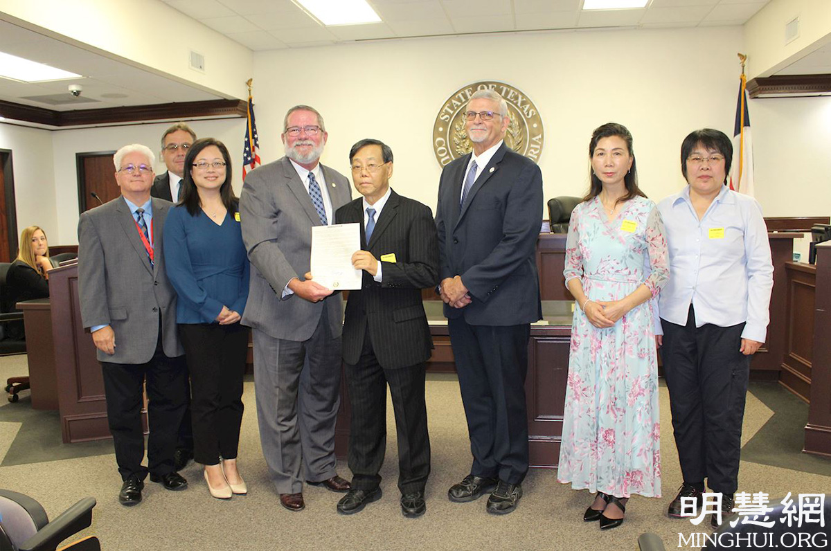 七月十三日上午九点,在布拉索内亚郡大楼(Courthouse)内,郡长小L.M.马特、塞贝斯塔(L.M. “Matt” Sebesta,Jr.)主持和三位委员组成的每月郡行政例行的公开会议,部份法轮功学员和当地部份居民参加了此次会议。郡长宣读了一项“声援法轮功学员”的决议案内容,郡长和三位委员一致同意通过这项决议。