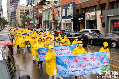 游行队伍从市中心的皇后公园出发,经Bay街,一直往南,经Queen街西行,贯穿中区唐人街的Spadina大道,历时两个多小时。天国乐团打头阵,跟着是“法轮大法好”方阵、停止迫害方阵和“九评”三退方阵等几大方阵。