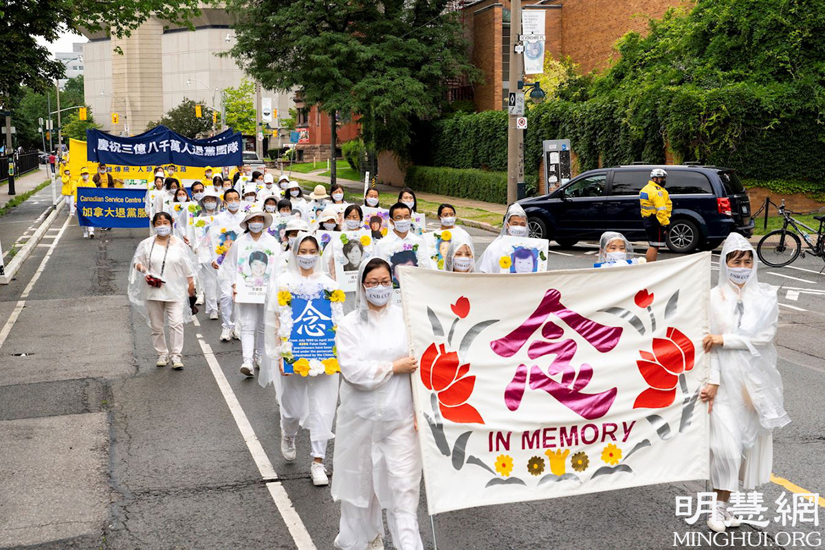 【明慧网二零二一年七月十九日】(明慧多伦多记者站报道)自二十二年前,中共开始对信仰真、善、忍的法轮功学员的残酷迫害,法轮功学员和平理性、从不放弃、从不妥协的抗争,让举世瞩目。在反迫害二十二周年之际,二零二一年七月十七日,加拿大多伦多法轮功学员在市中心举行了反迫害大游行,呼吁人们的正义和良知,呼吁共同解体中共,制止长达二十二年的迫害。有民众表示是时候结束中共、停止迫害法轮功了。