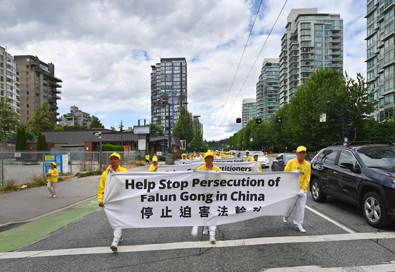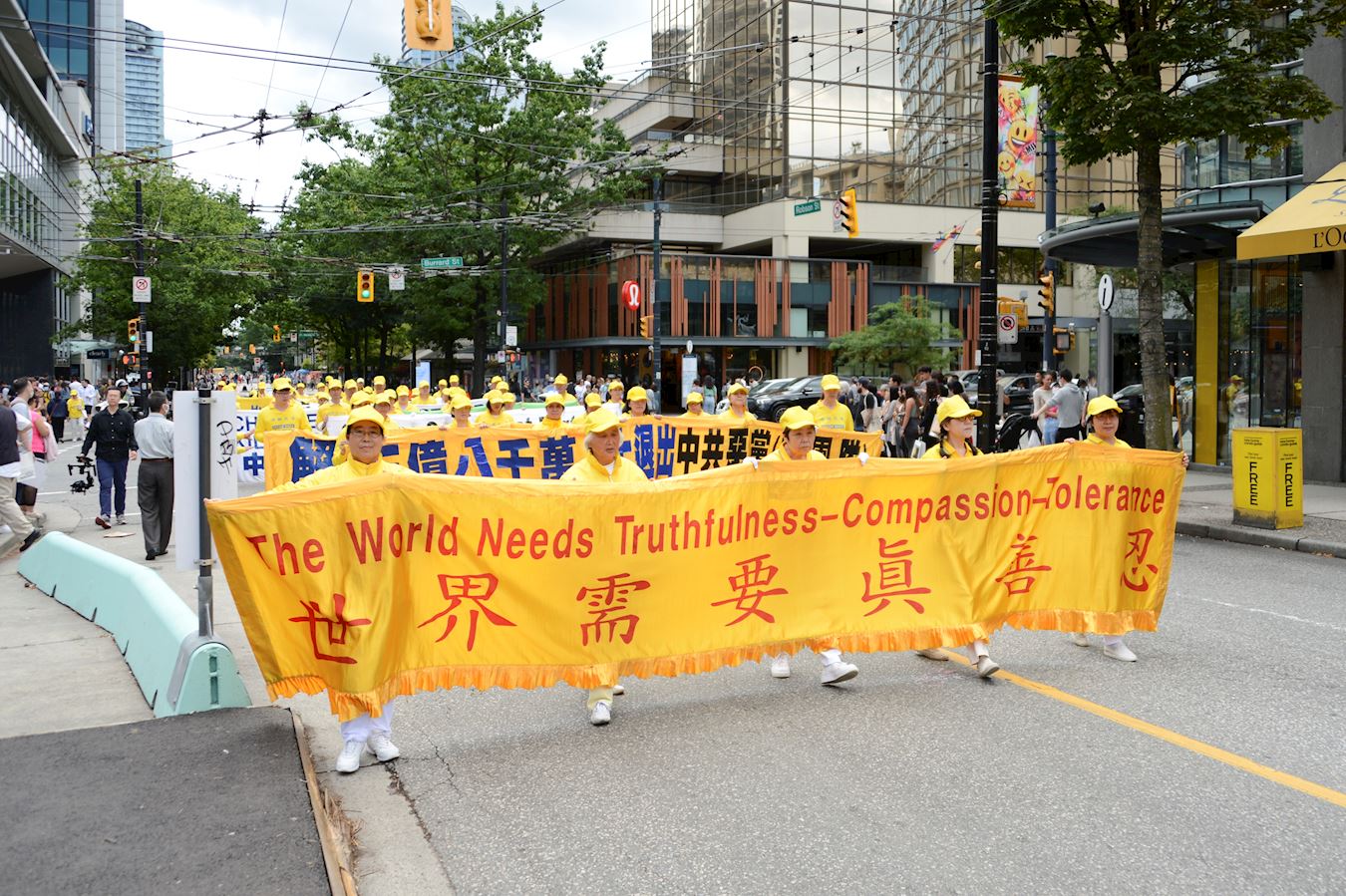法轮功学员们手中的横幅,向民众传递着重要信息:“法轮大法好”、“停止迫害法轮功”、“世界需要真善忍” 、“解体中共 制止迫害”、“共产主义的终极目的是毁灭人类”、“退出中共保平安”等。法轮功学员盛大的游行成为当天温哥华一道独特风景线。