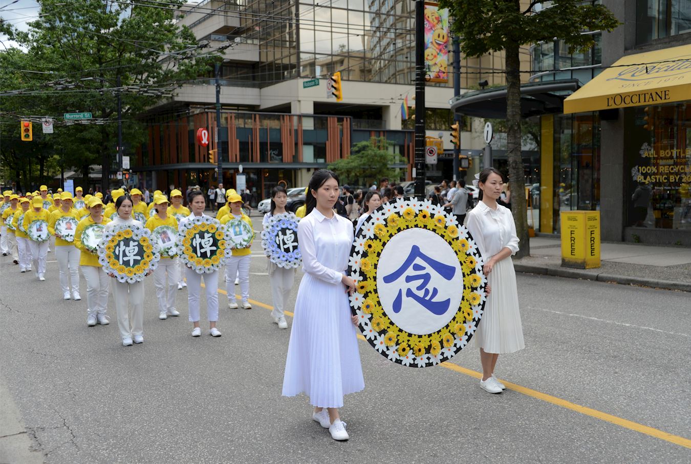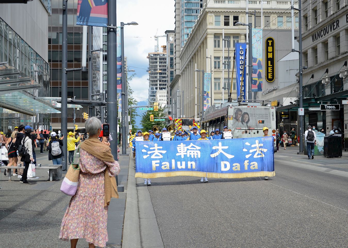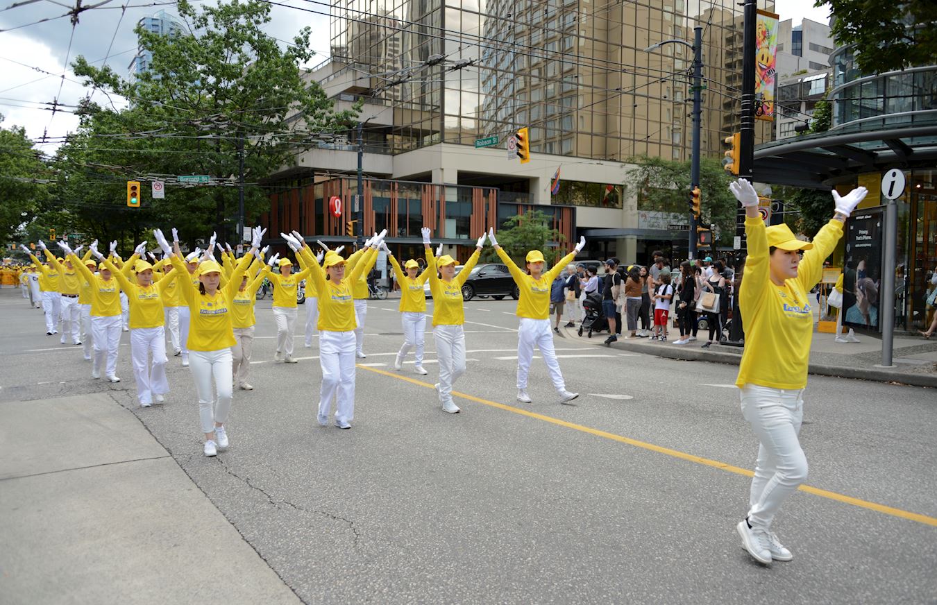 当天下午一时三十分,游行队伍由警车开道,从温哥华艺术馆出发,途经市中心多条繁华街道。天国乐团的演奏吸引了成群的行人驻足观看、拍照、录像。有路人特意走到游行队伍前竖起大拇指,更有司机鸣笛支持。