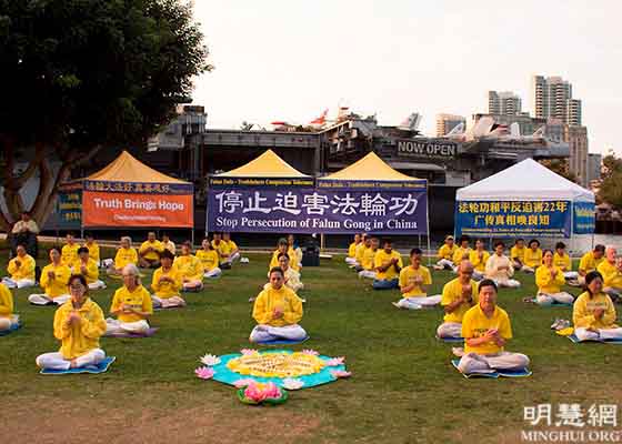 七月十七日,在和平反迫害二十二年之际,圣地亚哥法轮功学员在当地著名景点附近举行集体炼功、讲真相和烛光悼念等活动。