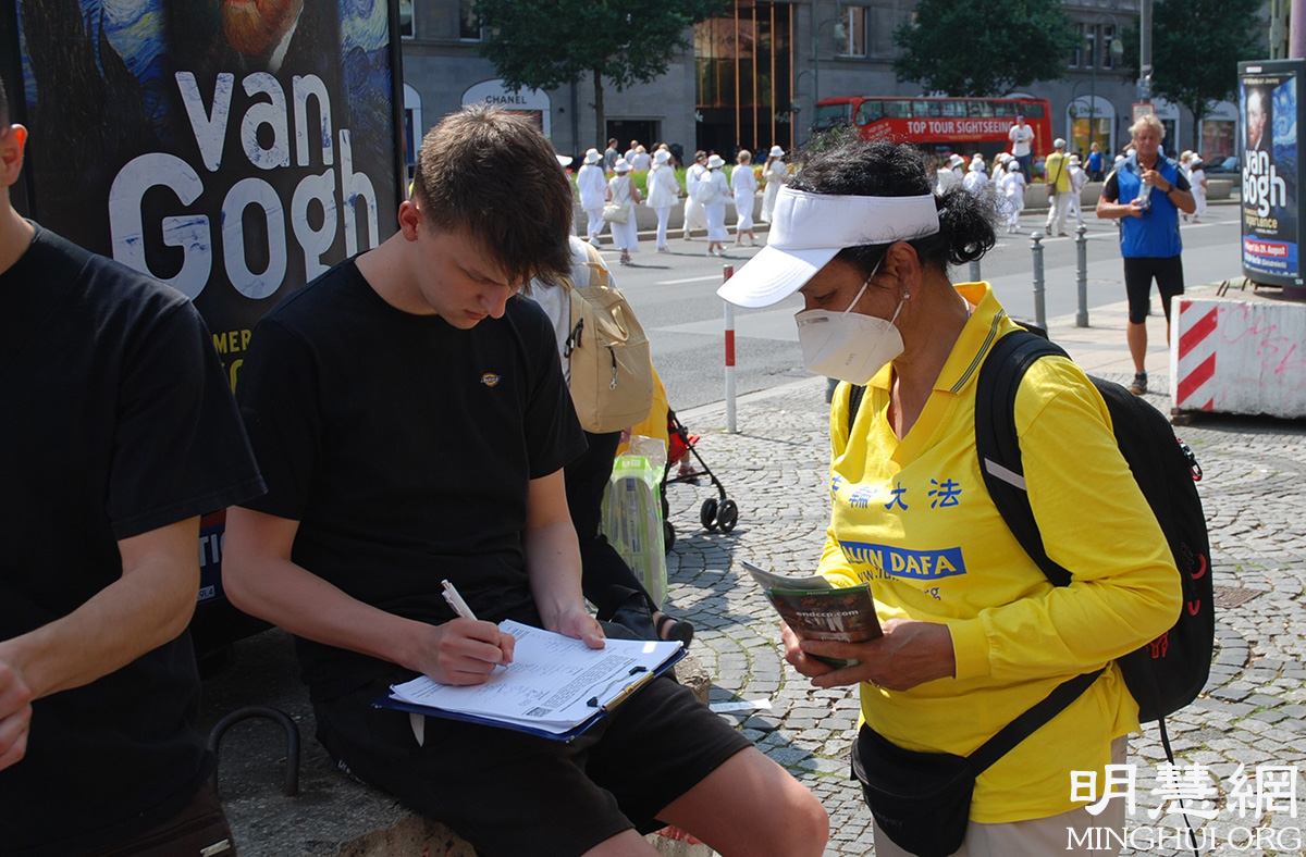 随后她来到维滕贝格广场(Wittenbergplatz)的信息摊位,签名支持法轮功学员。谈及中共对法轮功的迫害,她认为:“这无法容忍,这样的迫害(法轮功)根本就不该发生,无论在哪,这样的迫害不该存在。这完全违背了人权,根本就不该发生。”一直以来她非常关注在中(共)国的人权问题,她认为一直以来因为经济的原因,让中(共)国的很多人权问题被忽视。但她认为和中国(共)做生意的政府有责任关注在中国的人权。她认为:“越来越多的这样(法轮功学员)的活动能够让更多人来关注人权,或者找到其他的解决方法。”