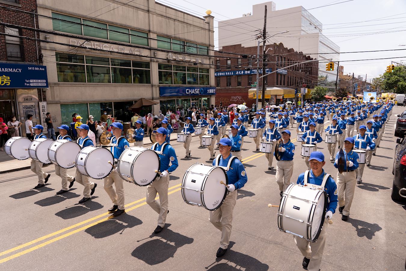 游行队伍浩浩荡荡,从打头的天国乐团到最后边的三退方阵,乐团、横幅、彩旗,覆盖了八大道整个华人社区,吸引了众多民众驻足观看并视频拍照,民众称赞“游行队伍很壮观”。