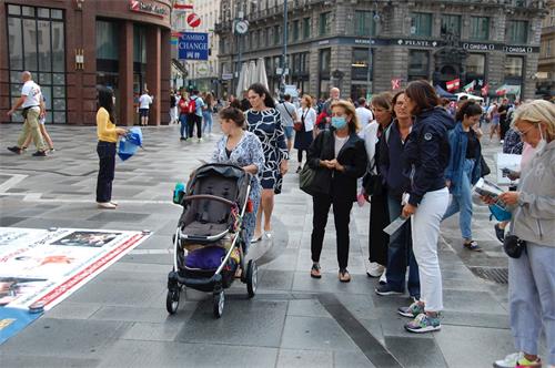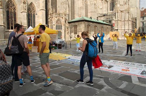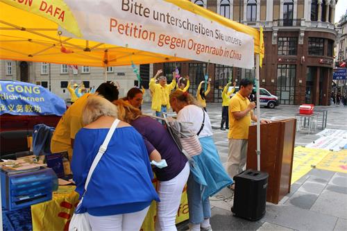 一位奥地利女士和弟弟经过学员的活动现场,她表示非常感动,因为几年前,她在史蒂芬广场也碰到了法轮功学员的信息日活动。没想到今年在这个特殊的日子里,又能碰到法轮功学员。
