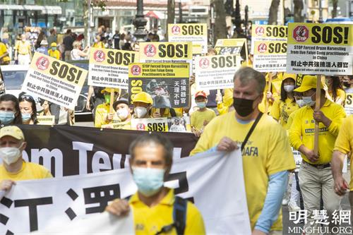 【明慧网二零二一年七月二十日】(明慧德国记者站采访报道)眼看着那队身着金黄服饰的游行人群渐渐远去,他们整齐有力的腰鼓声越来越轻,就连护送他们的警车也越来越小了,地理学家雷吉娜·帕茲(Regine Patz)才慢慢地收起手机,结束录影。她缓缓地转过身子,告诉记者,“这里所展示出的一切让我心里非常难过,这是一个非常严肃的呼吁,他们(法轮功学员)在把自己的心捧出来恳请帮助,这让我感触颇深,我希望能有效的帮到他们。”