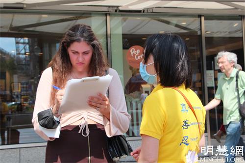 随后她来到维滕贝格广场(Wittenbergplatz)的信息摊位,签名支持法轮功学员。谈及中共对法轮功的迫害,她认为:“这无法容忍,这样的迫害(法轮功)根本就不该发生,无论在哪,这样的迫害不该存在。这完全违背了人权,根本就不该发生。”一直以来她非常关注在中(共)国的人权问题,她认为一直以来因为经济的原因,让中(共)国的很多人权问题被忽视。但她认为和中国(共)做生意的政府有责任关注在中国的人权。她认为:“越来越多的这样(法轮功学员)的活动能够让更多人来关注人权,或者找到其他的解决方法。”