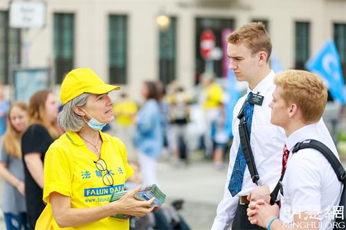 图1:二零二一年七月十七日,法轮功学员在德国柏林勃兰登堡门前,举办反迫害二十二周年集会。