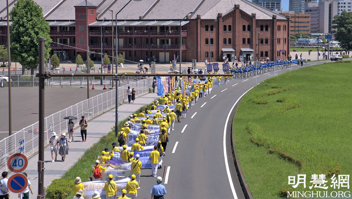 游行队伍从樱木町车站前的广场出发,历时两个小时。在天国乐团的引领下,沿着横滨市内的繁华街道行进。法轮功学员打出的横幅和旗帜上面写着“法轮大法好”、“法轮大法洪传全世界一百多个国家”、“打倒中共恶魔”、“中共≠中国”、“3亿8千万中国人退出中共党团队组织”等内容。