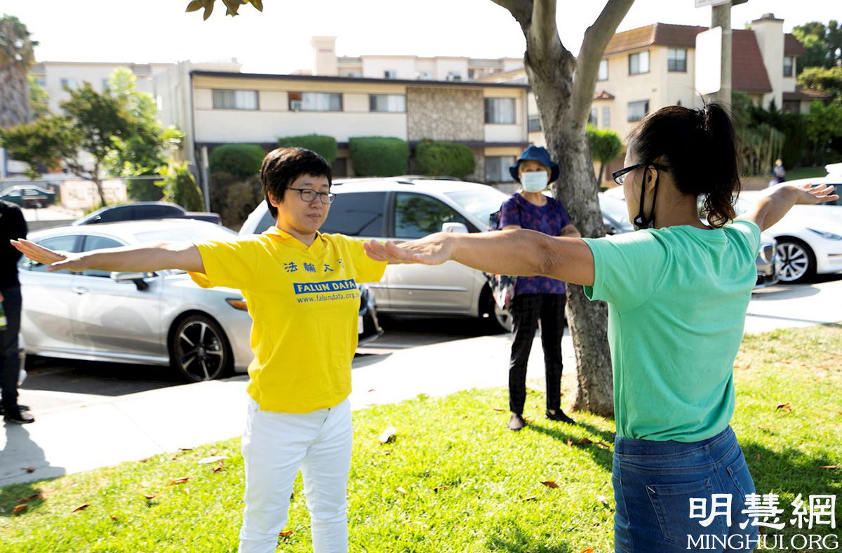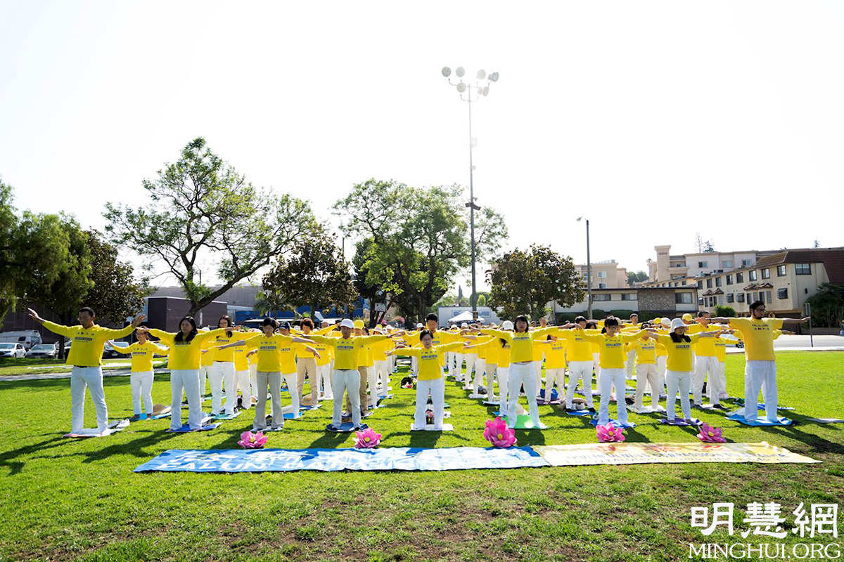 图1:二零二一年七月十七日,洛杉矶部份法轮功学员在蒙特利公园市(Monterey Park)的巴恩斯公园(Barnes Park)集体炼功,纪念法轮功反迫害二十二周年。