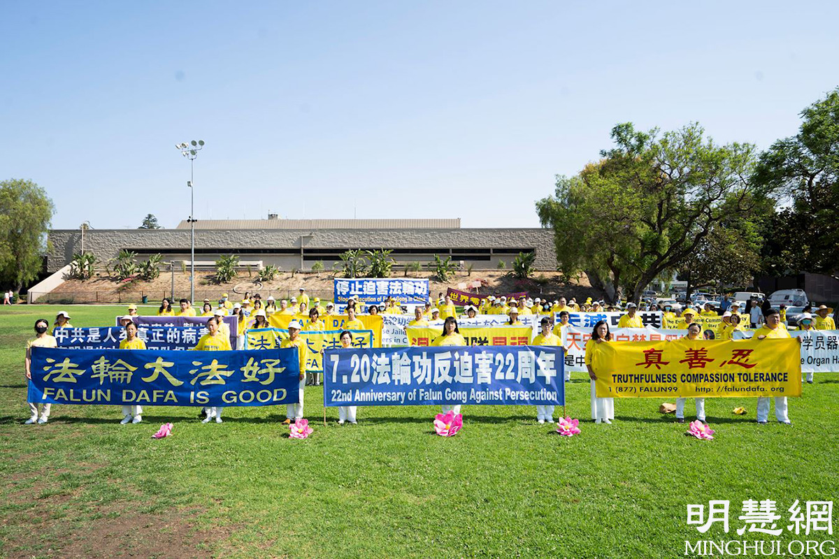 【明慧网二零二一年七月二十一日】在法轮功和平理性反迫害二十二周年之际,二零二一年七月十七日,洛杉矶部份法轮功学员在蒙特利公园市(Monterey Park)的巴恩斯公园(Barnes Park),举行炼功、集会、真相长城及真相车队游行等活动,揭露、抗议中共对法轮功长达二十二年的残酷迫害,唤醒人们的正义良知,远离中共、解体中共,结束迫害。