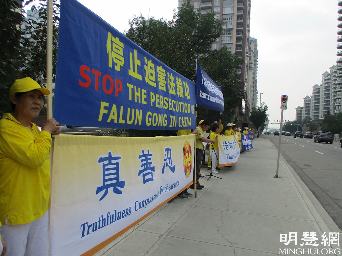 图1~3:2021年7月19日下午,加拿大卡尔加里部份法轮功学员在中领馆前集会,谴责中共对法轮功长达22年的迫害。