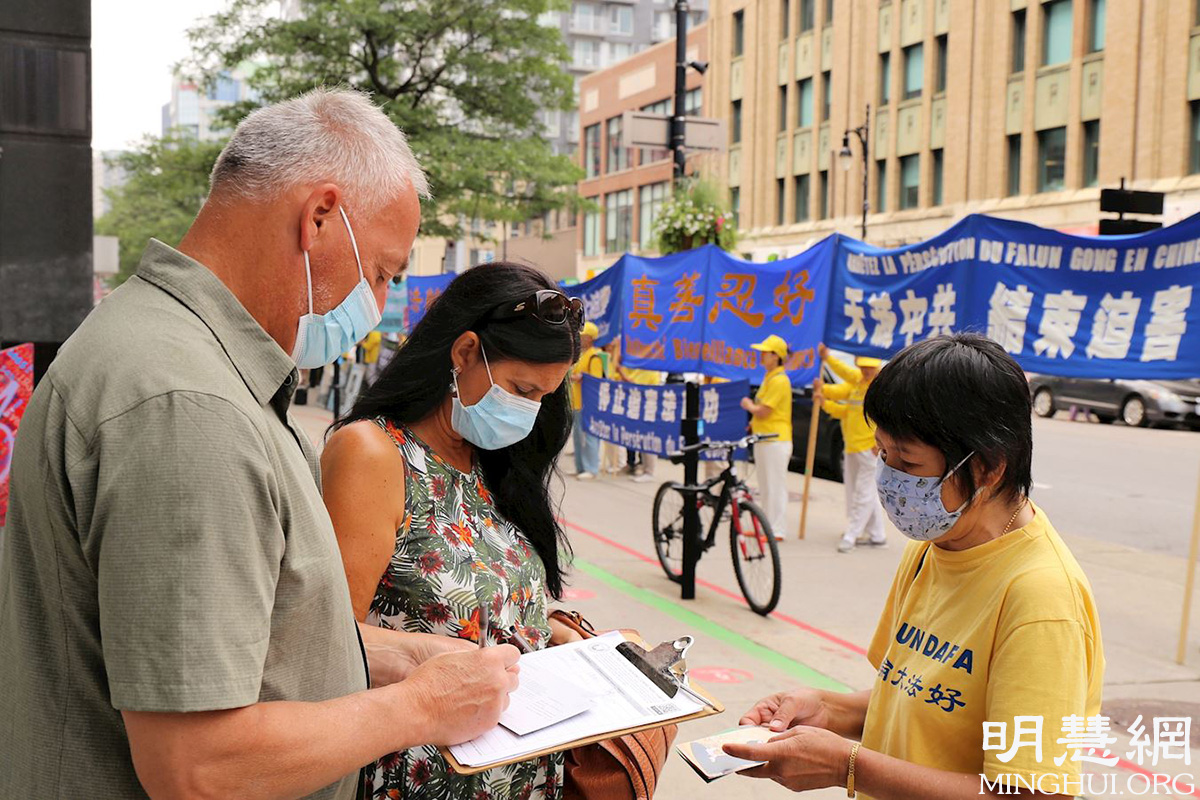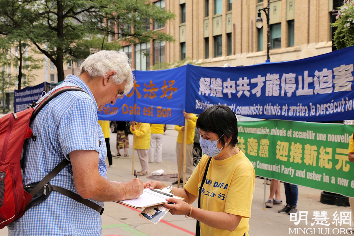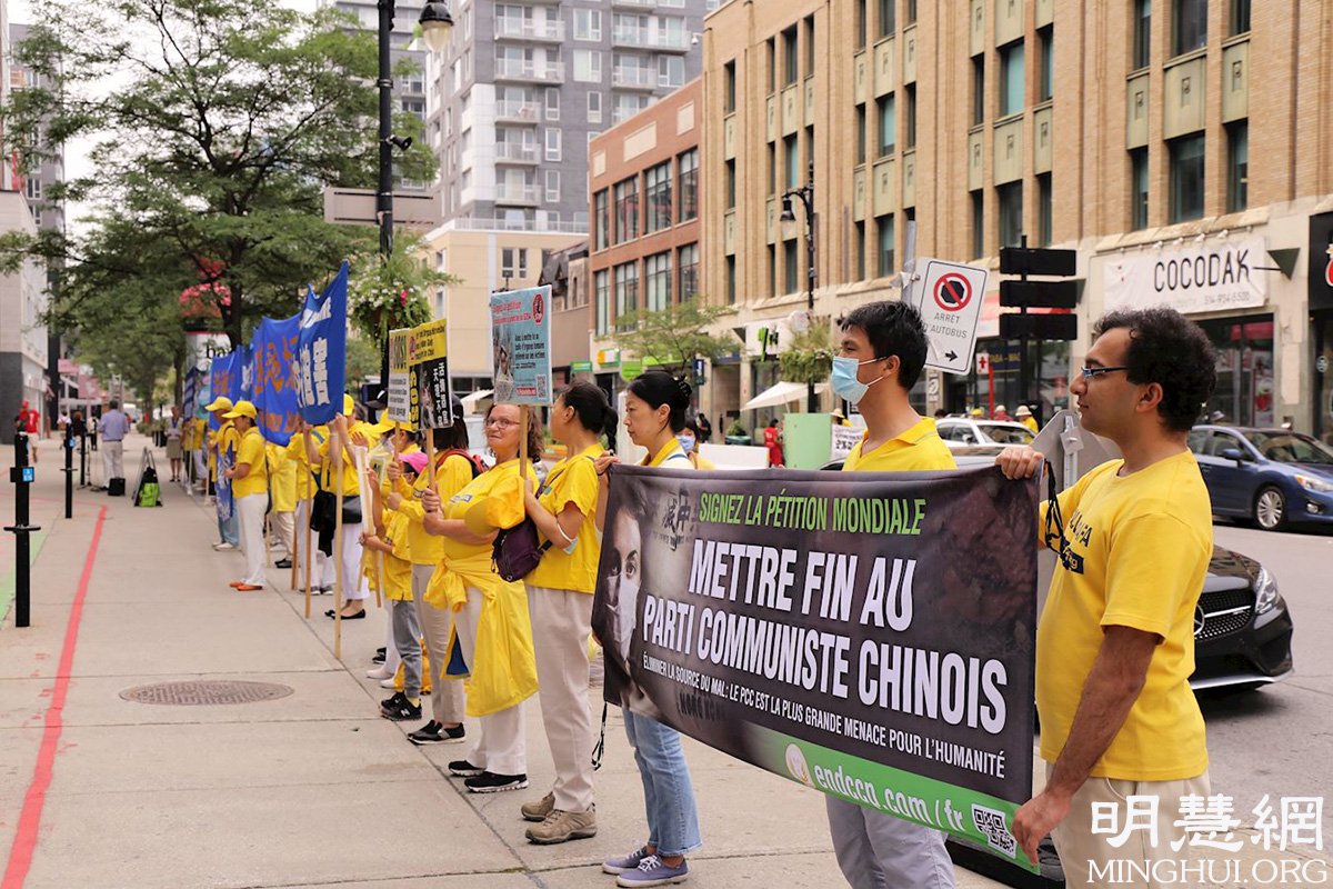 2021年7月20日,在反迫害22周年之际,加拿大蒙特利尔部份法轮功学员在位于圣凯瑟琳大街的中领馆前举行集会,呼吁立即停止迫害法轮功。过往民众纷纷表达对法轮功的支持,人们在反迫害征签信上签字,更有民众表示中共是犯罪组织,世界不应对迫害袖手旁观。