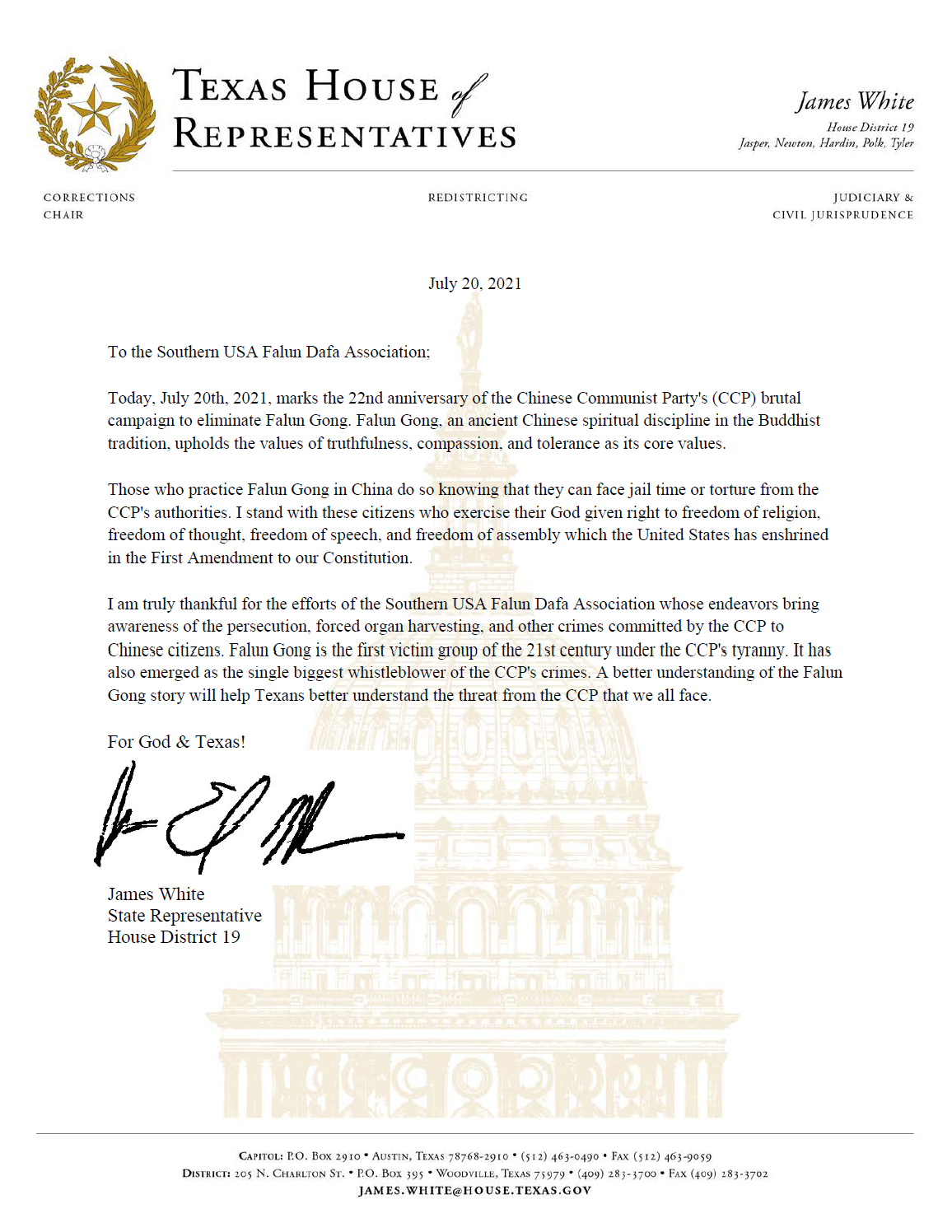 我真心感谢美国南部法轮大法学会的努力,他们的努力让中国公民了解到中共迫害、强摘器官和其它罪行。法轮功是二十一世纪中共暴政下的第一个受害者群体。他们也是举报中共罪行的最大人群。更好地了解法轮功的故事将有助于德克萨斯人更好地理解我们都面临的来自中共的威胁。