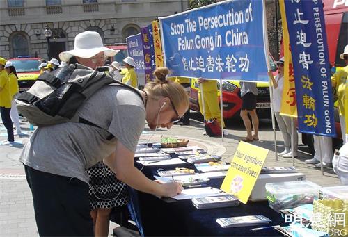 一位与法轮功学员交谈很久的女士宝拉(Paula),很高兴地谈到她为什么支持法轮功学员的反迫害活动,她说:“我认为对世界上某些人权团体来说,这是让人们了解其遭遇的特别好的方式。我们需要让人们了解现代奴工、活摘器官。