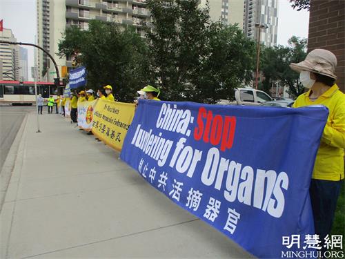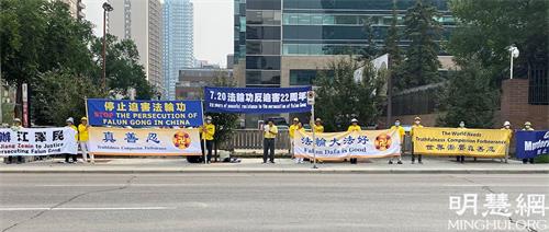 '图1~3:2021年7月19日下午,加拿大卡尔加里部份法轮功学员在中领馆前集会,谴责中共对法轮功长达22年的迫害。'