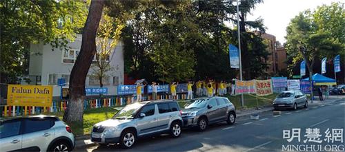 '图6:西班牙法轮功学员在中使馆前发正念'