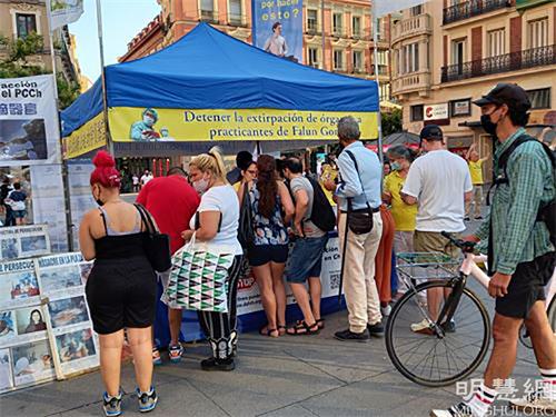 七月的西班牙炎阳炙人,七月二十日上午,一面面真相横幅和展板挂满了中使馆对面的长街,又正好是个红绿灯口,来来往往的车辆经过这里都不自觉地放慢了车速看横幅上的内容,学员等红灯车停的时候就给司机们递上真相传单。