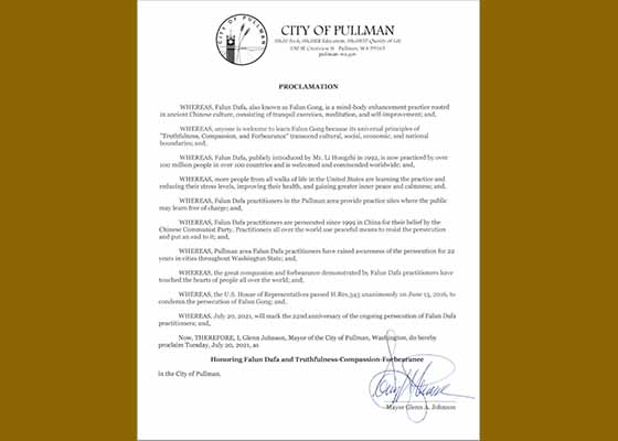 美国华盛顿州普曼市为法轮大法颁发褒奖。市长格兰·约翰逊,定二零二一年七月二十日为普曼市致敬法轮大法暨真、善、忍日。