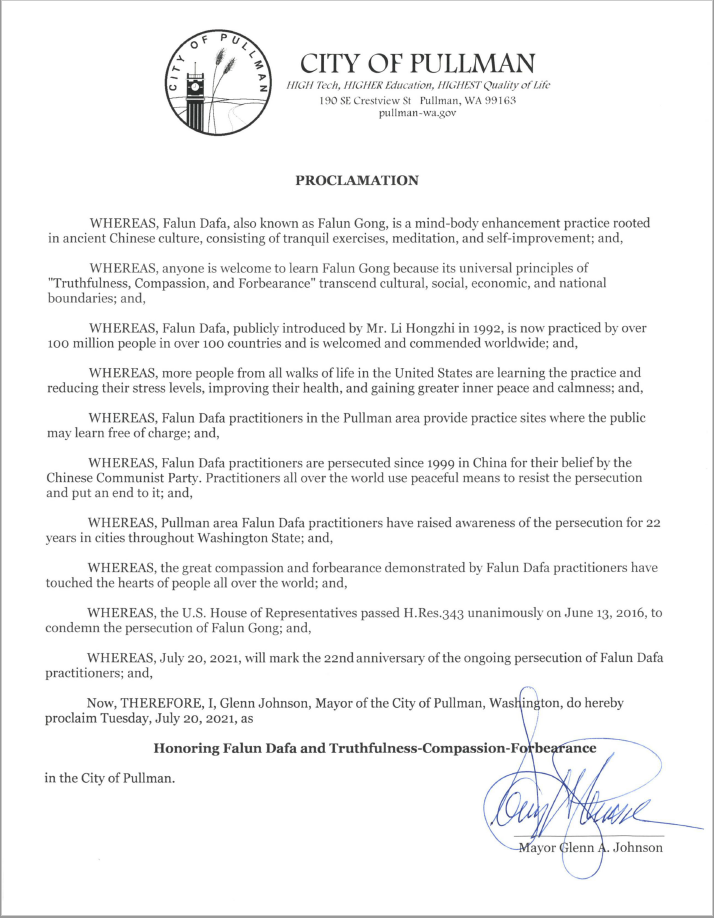 ![]() 图:普曼市市长格兰·约翰逊发褒奖,定二零二一年七月二十日为普曼市致敬法轮大法暨真、善、忍日。 |