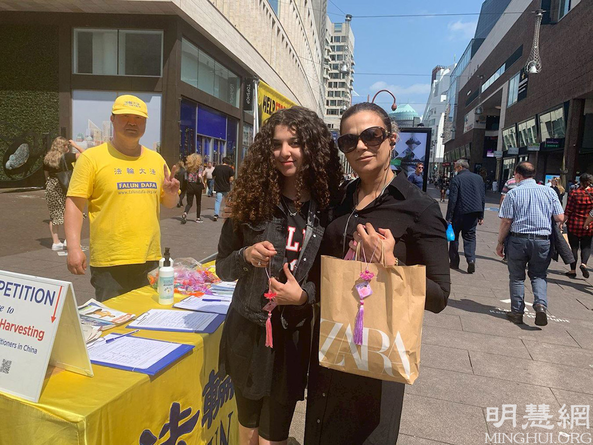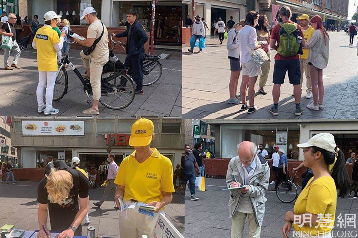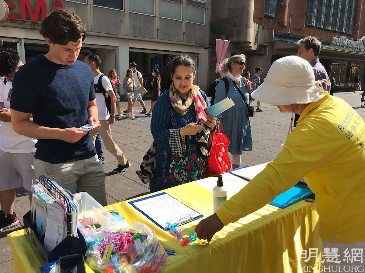 7月20日下午,法轮功学员又来到海牙最热闹的商业中心,传递法轮功真相,揭露中共活摘法轮功学员人体器官的罪恶,并征集签名,得到许多民众的支持。