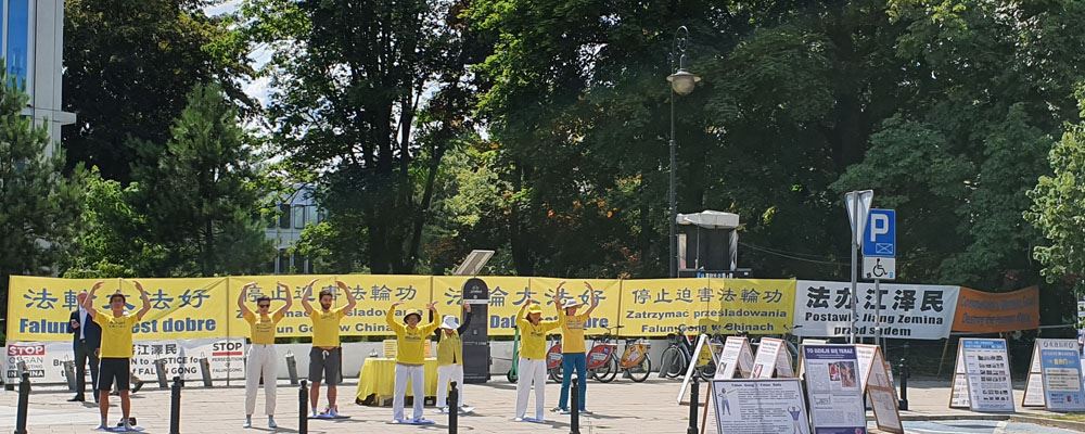 在议会大楼的对面,悬挂着醒目的“法轮大法好”、“停止迫害法轮功”、“法办江泽民”、“共产主义的终极目的是毁灭人类”及“提高道德是人类唯一出路”等条幅,长长的街边摆着中波英三种文字法轮功真相展板,在慈悲祥和的《普度》、《济世》音乐中,法轮功学员发放传单和波语《九评共产党》,为过往行人及议员们讲真相。多位议员、记者及市民在“制止迫害,解体中共”的征签簿上签名,也有很多人对法轮功学员展示的优美舒缓的法轮功功法感兴趣,非常高兴的拿取资料。