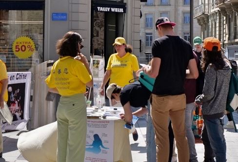 图1:法轮功学员在洛桑设立展位,演示功法,向人们介绍法轮功及其真相。