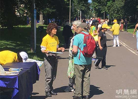七月二十四日,部份法轮功学员在苏格兰首府爱丁堡举行讲真相活动,揭露中共22年来对法轮功犯下的罪恶。许多民众用行动表达了支持。