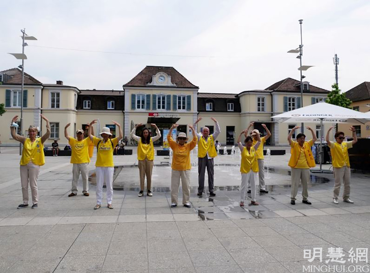 图1:法轮功学员在德莱蒙火车站广场炼功