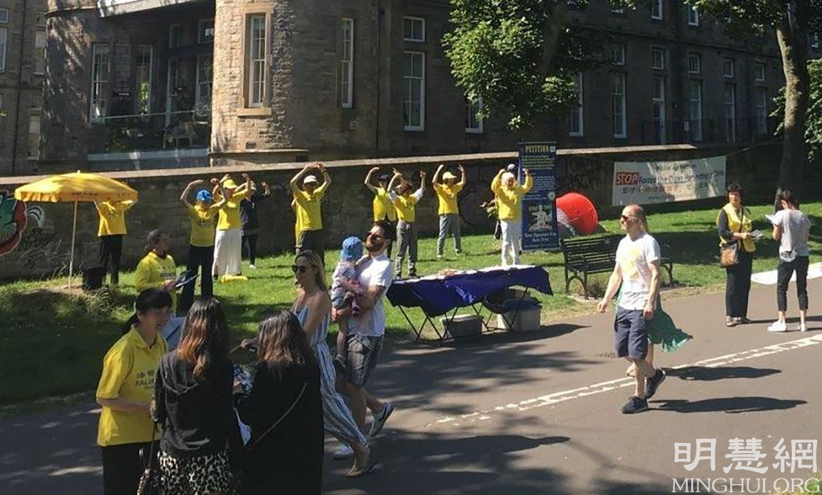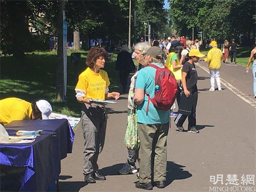 民众弗雷德里克(Fredrik)在经过王家公园时对学员说:”我的朋友拉斯(Lars)告诉我,法轮功曾经在中国有一亿炼功人。你们要坚持啊!”
