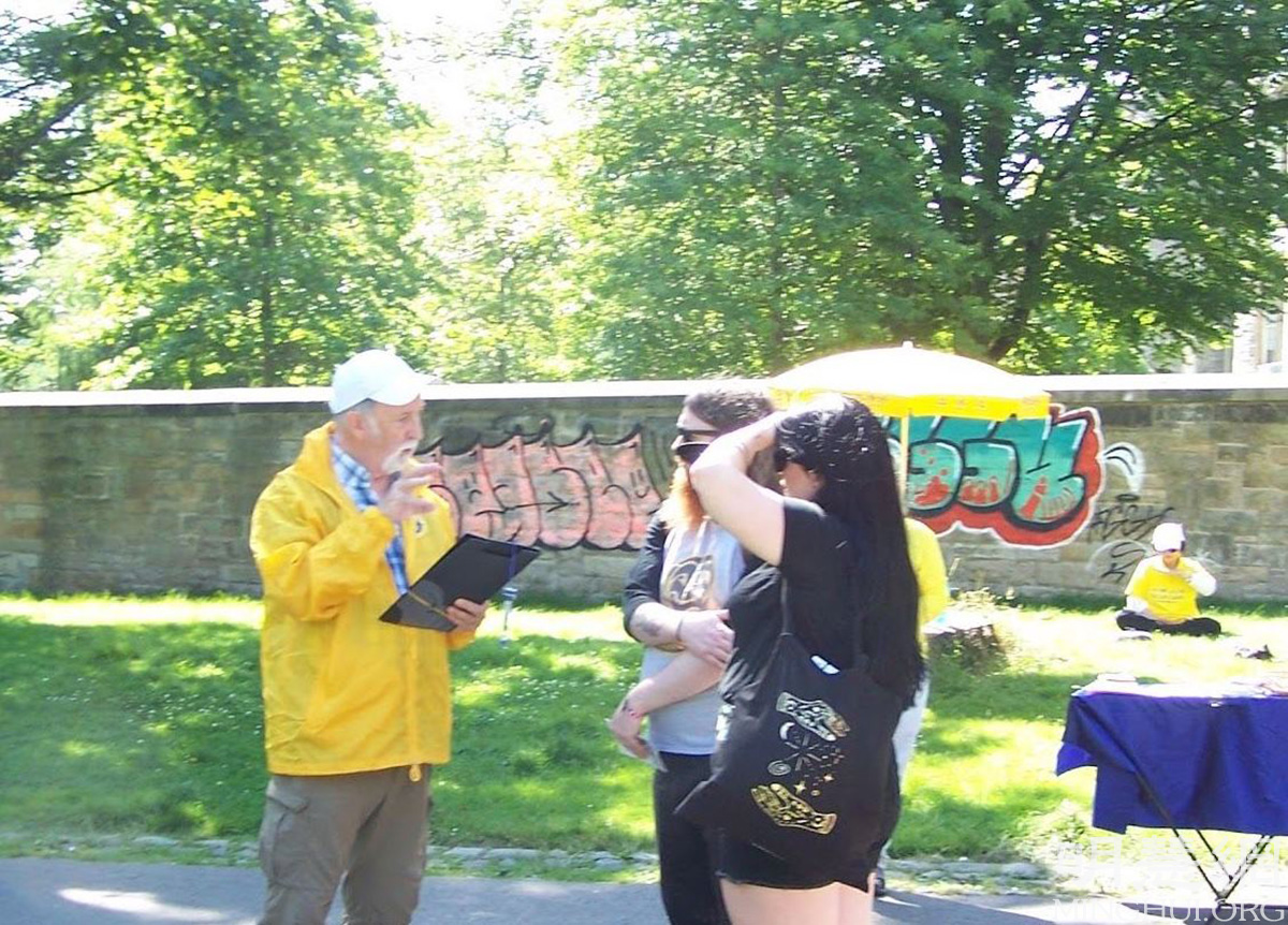 下午,两位中年西人男子走来四处看看。他们走到横幅前,学员向他们介绍了法轮功功法及发生在中国的迫害事实。