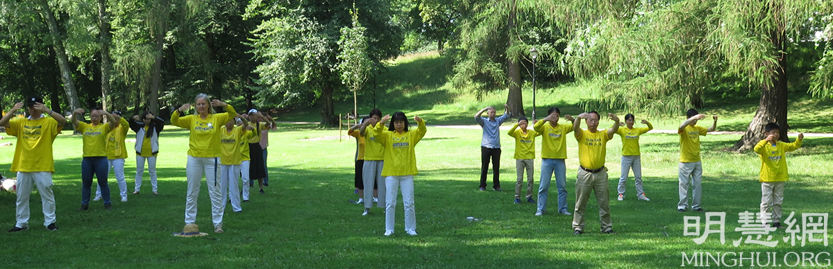 民众弗雷德里克(Fredrik)在经过王家公园时对学员说:”我的朋友拉斯(Lars)告诉我,法轮功曾经在中国有一亿炼功人。你们要坚持啊!”