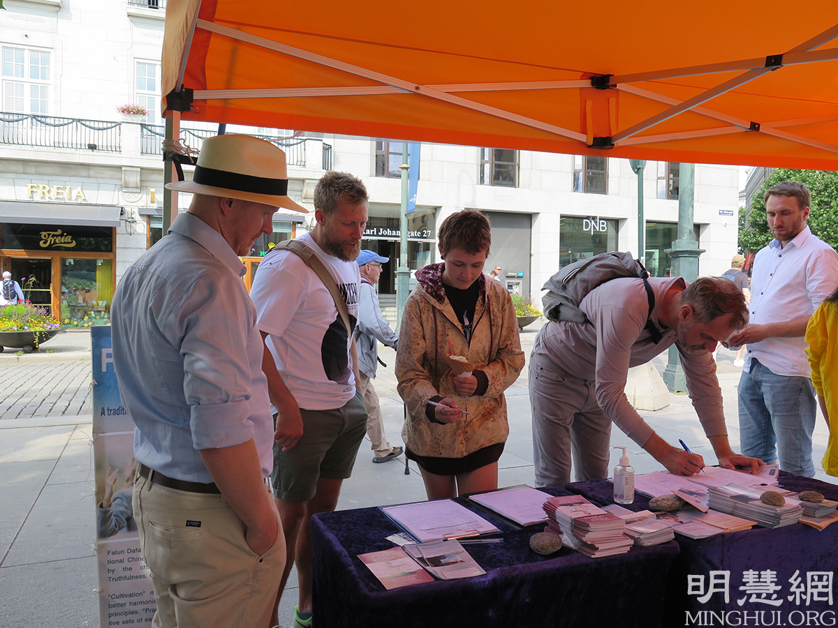 活动分别在中共驻挪威使馆前,王家公园和挪威国会前举行。活动中,挪威民众了解了法轮功学员在修炼真、善、忍的过程中不断使自己成为一个为他人着想的好人,也了解了中共对修炼人的残酷迫害。许多人认为面对中共的惨绝人寰,每个人都有责任表明自己的立场,很多民众在给挪威政府和国会“帮助制止对法轮功学员的酷刑及活体摘取法轮功学员器官的呼吁信”上签名,帮助制止迫害。
