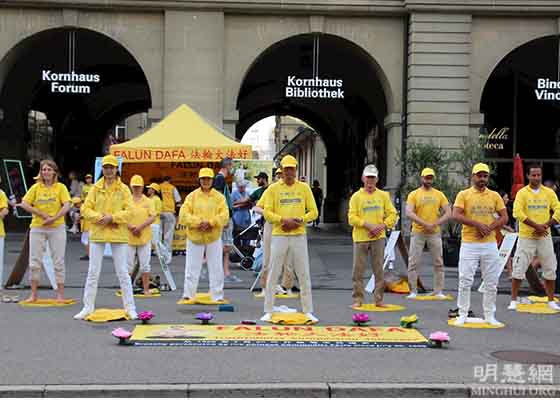瑞士法轮功学员于二零二一年七月二十四日,在首都伯尔尼的中领馆前及市中心的控豪斯广场举办活动揭露中共的迫害。