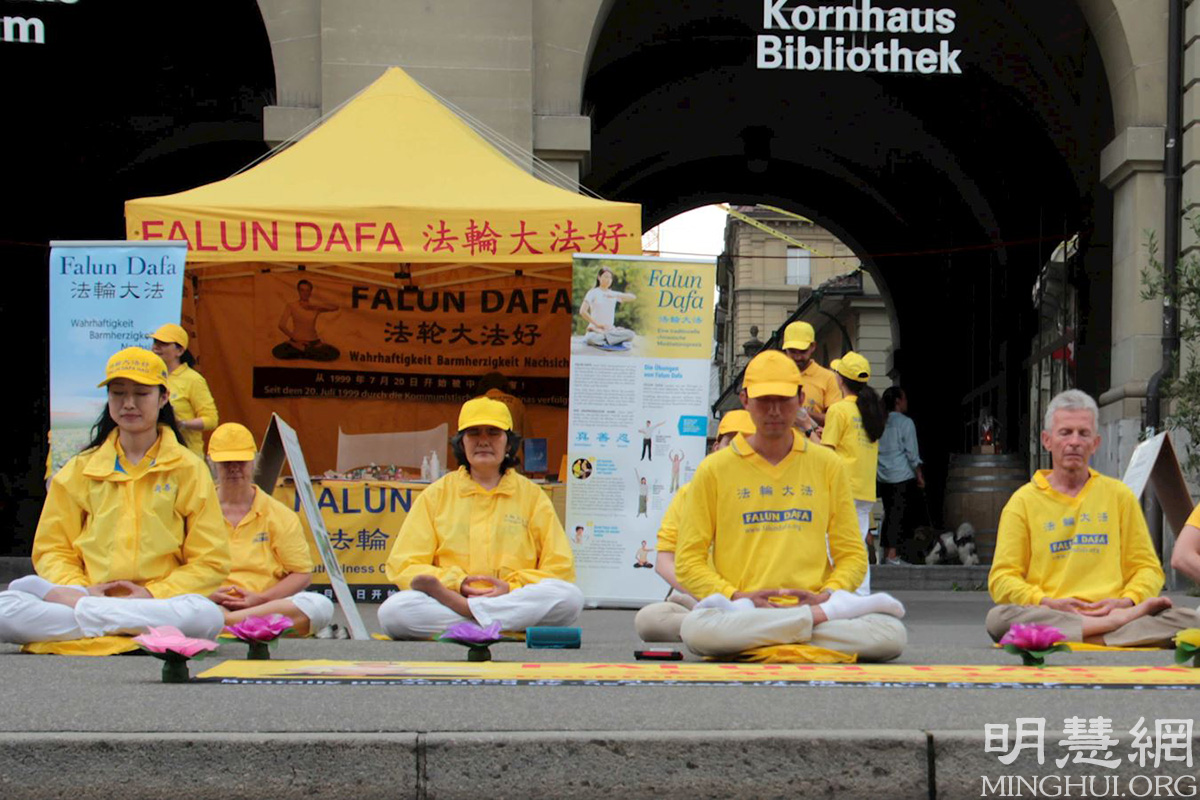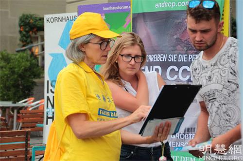 活动中,学员并宣读了多位瑞士议员的支持信。不少路人停下脚步,聆听学员们的演讲。很多人知道了法轮大法是教人按照真、善、忍做个好人,也了解到中共为什么要迫害法轮功。