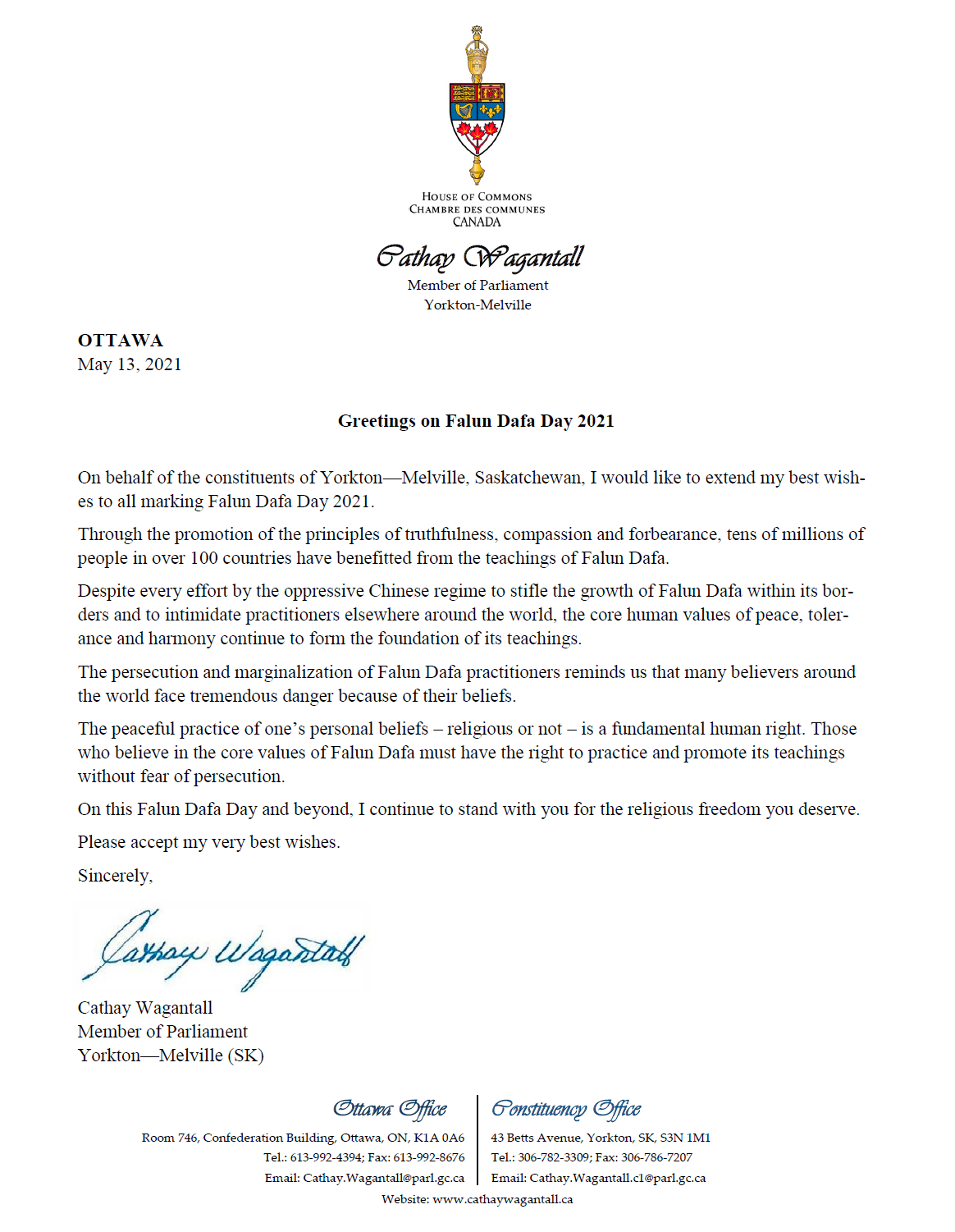 '图6:萨省国会议员瓦甘托(Cathay Wagantall)贺信'