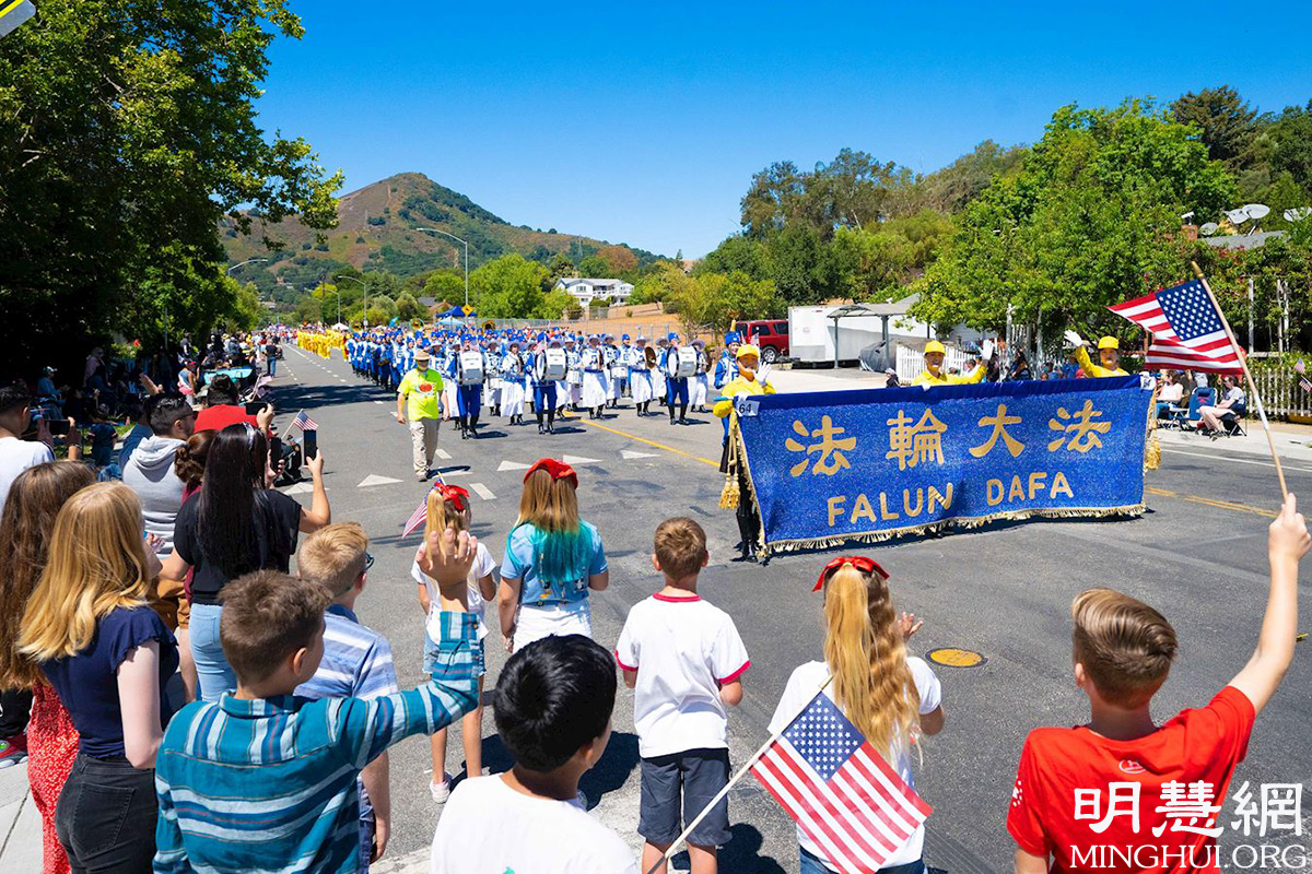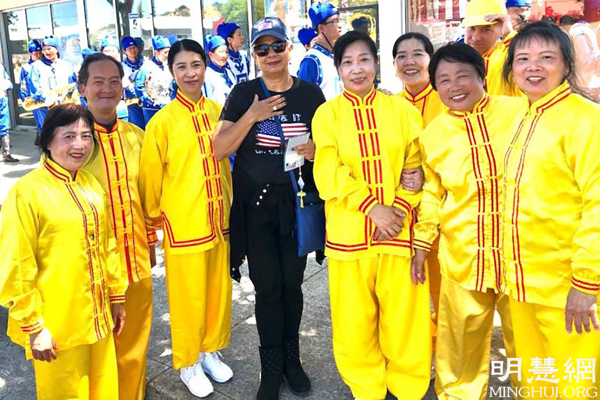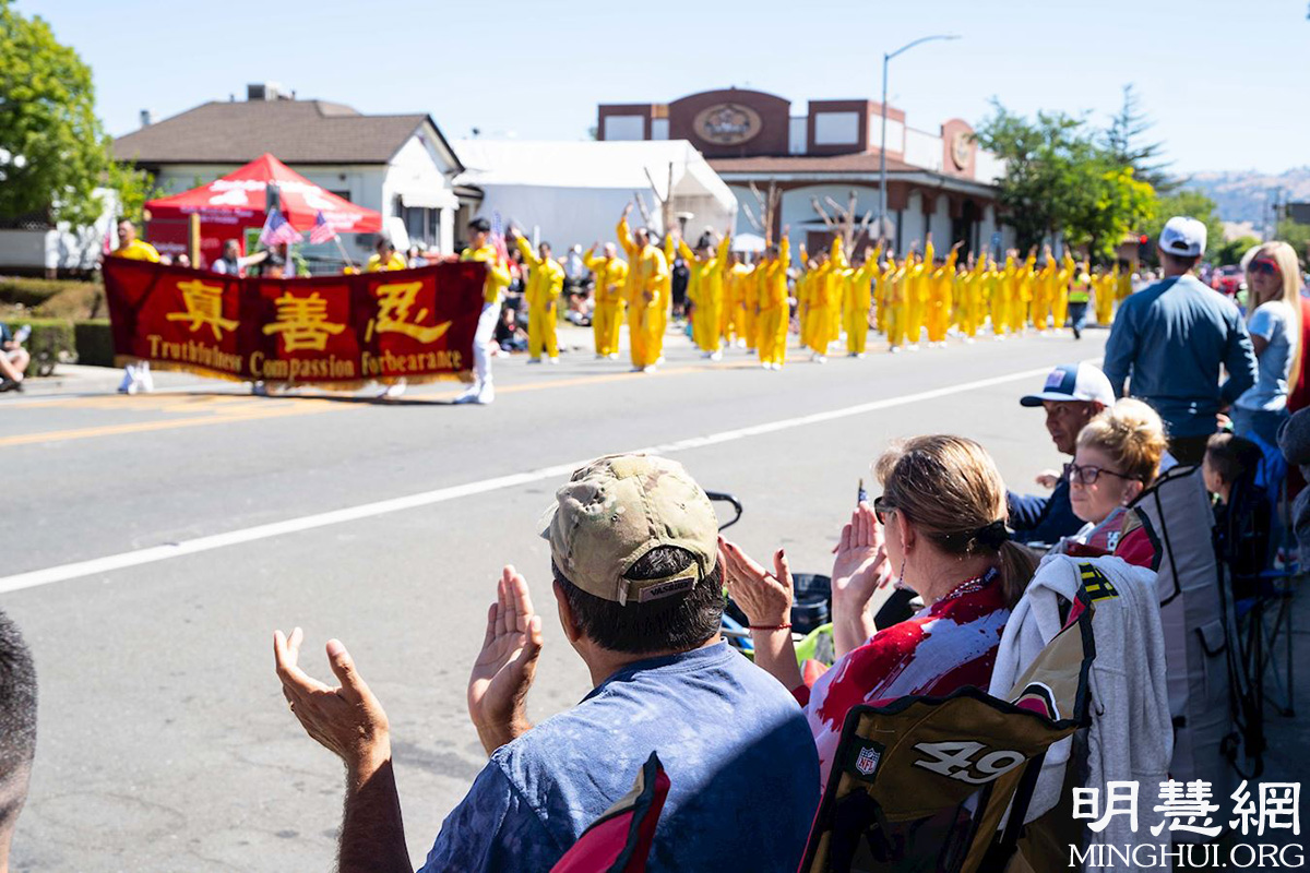 当天,法轮功学员的队伍经过时,道路两边的民众沸腾了,他们不断地鼓掌、挥手、拍照,并发出内心的欢笑,他们询问这是哪里来的队伍?!当他们了解到这是修炼真、善、忍的法轮功学员的队伍,学员们来自湾区各地时,他们纷纷竖起大拇指:“我们喜欢这支队伍。”