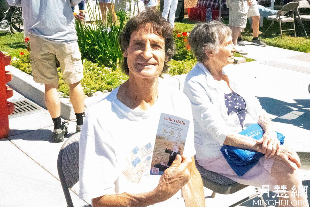 “我来看摩根山游行有好多年了,今天我们庆祝美国国庆,庆祝自由。”摩根山市居民道格(Doug)接过法轮功真相小册子说:“真、善、忍,太好了!我喜欢真、善、忍。”