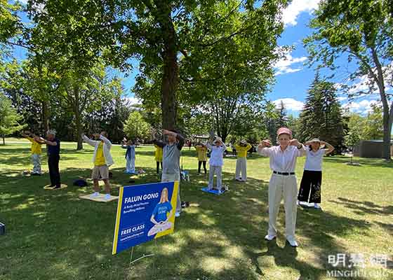 随着疫情放缓,渥太华几个开放的公园中、在市中心的街道上,人们又见到了法轮功学员的身影。