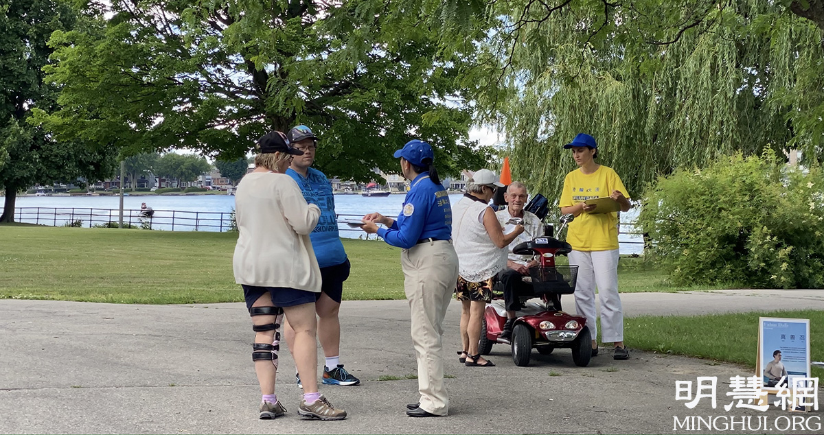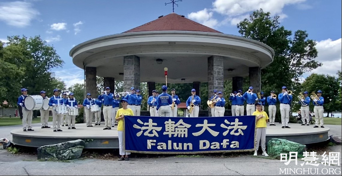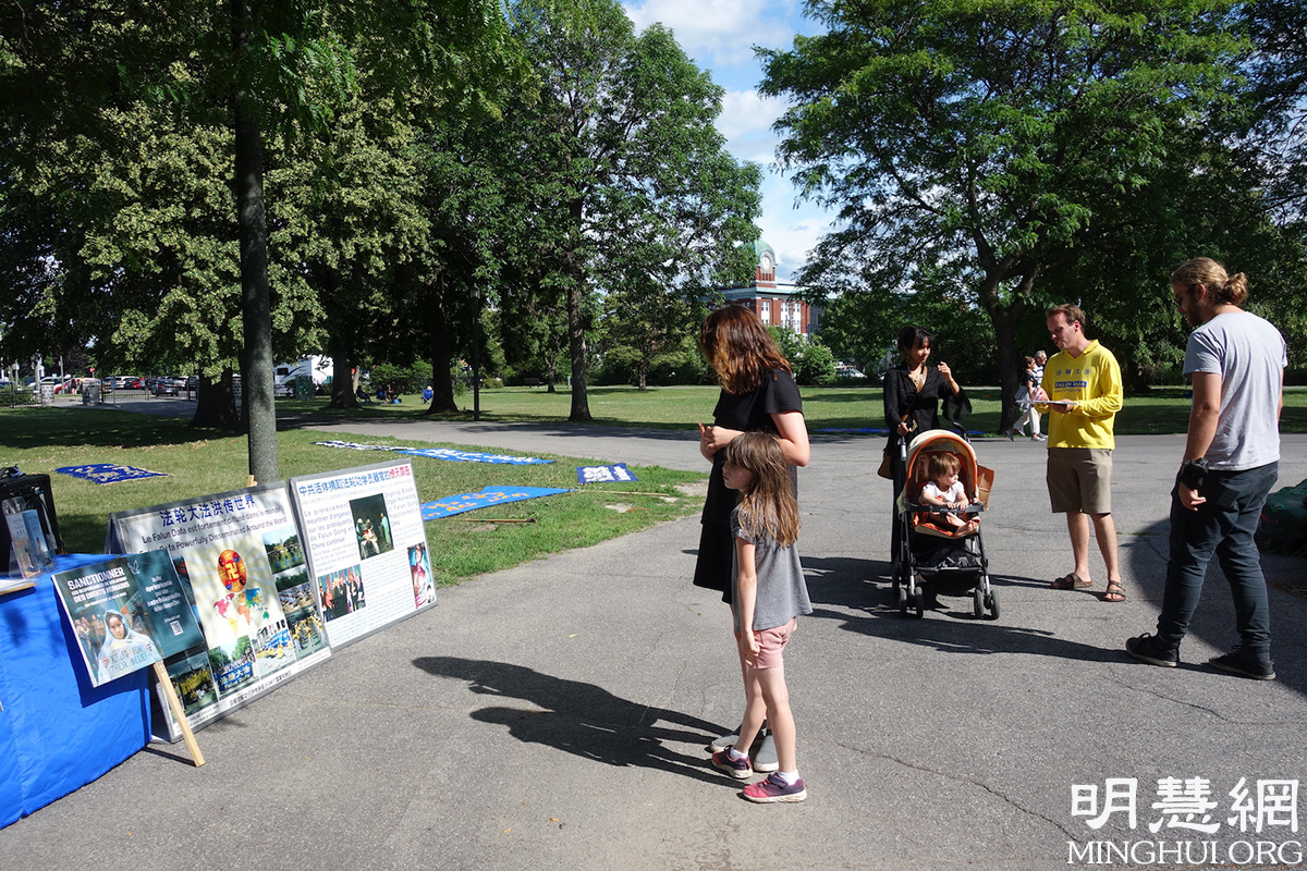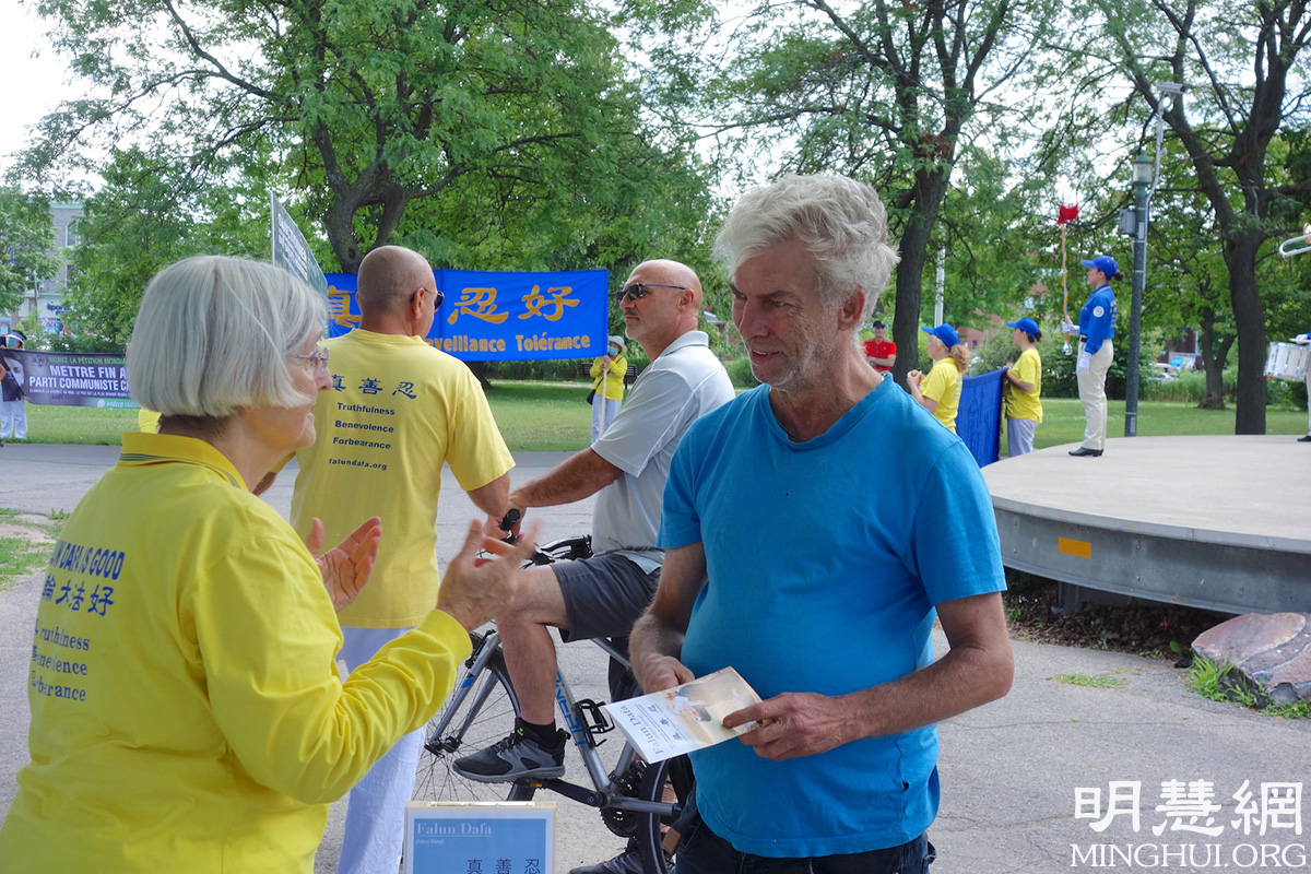 瓦勒菲尔德是圣劳伦河上的一个岛屿,也是一个风景如画的旅遊城市,当地居民以法裔为主。在河滨公园,法轮功学员拉开了“法轮大法好”、“真善忍好”横幅,天国乐团的演奏和五套炼功交替進行。祥和的场面吸引了公园里休閒消夏的民众,他们用鼓掌、双手合十来表达感谢。许多民众在和法轮功学员交谈后表示,支持法轮功学员反迫害。