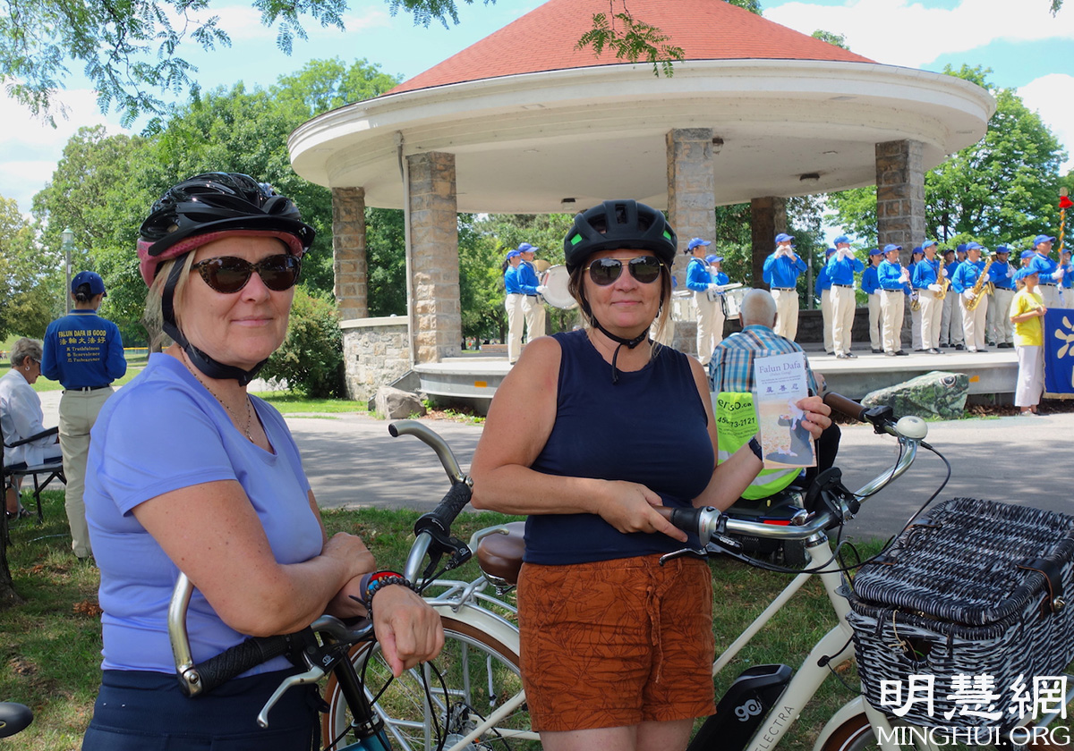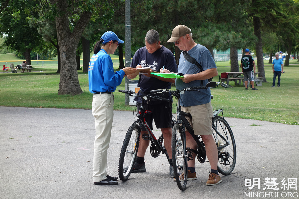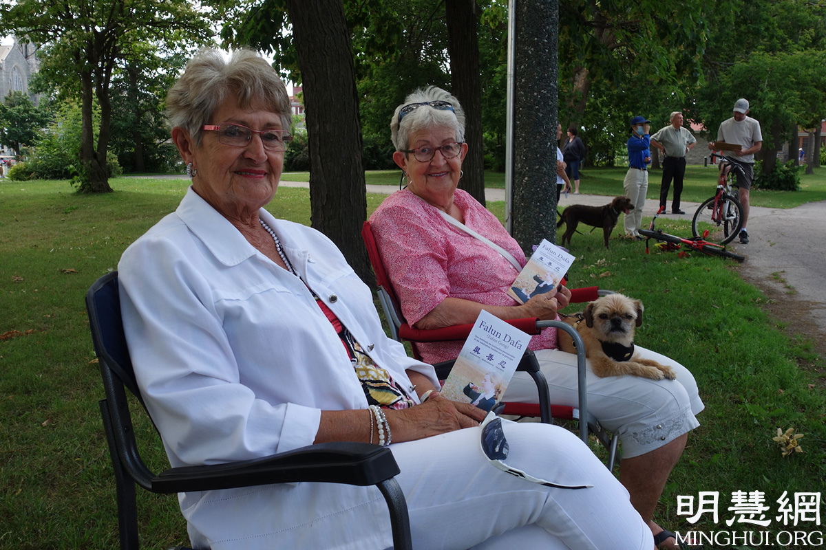 瓦勒菲尔德是圣劳伦河上的一个岛屿,也是一个风景如画的旅遊城市,当地居民以法裔为主。在河滨公园,法轮功学员拉开了“法轮大法好”、“真善忍好”横幅,天国乐团的演奏和五套炼功交替進行。祥和的场面吸引了公园里休閒消夏的民众,他们用鼓掌、双手合十来表达感谢。许多民众在和法轮功学员交谈后表示,支持法轮功学员反迫害。