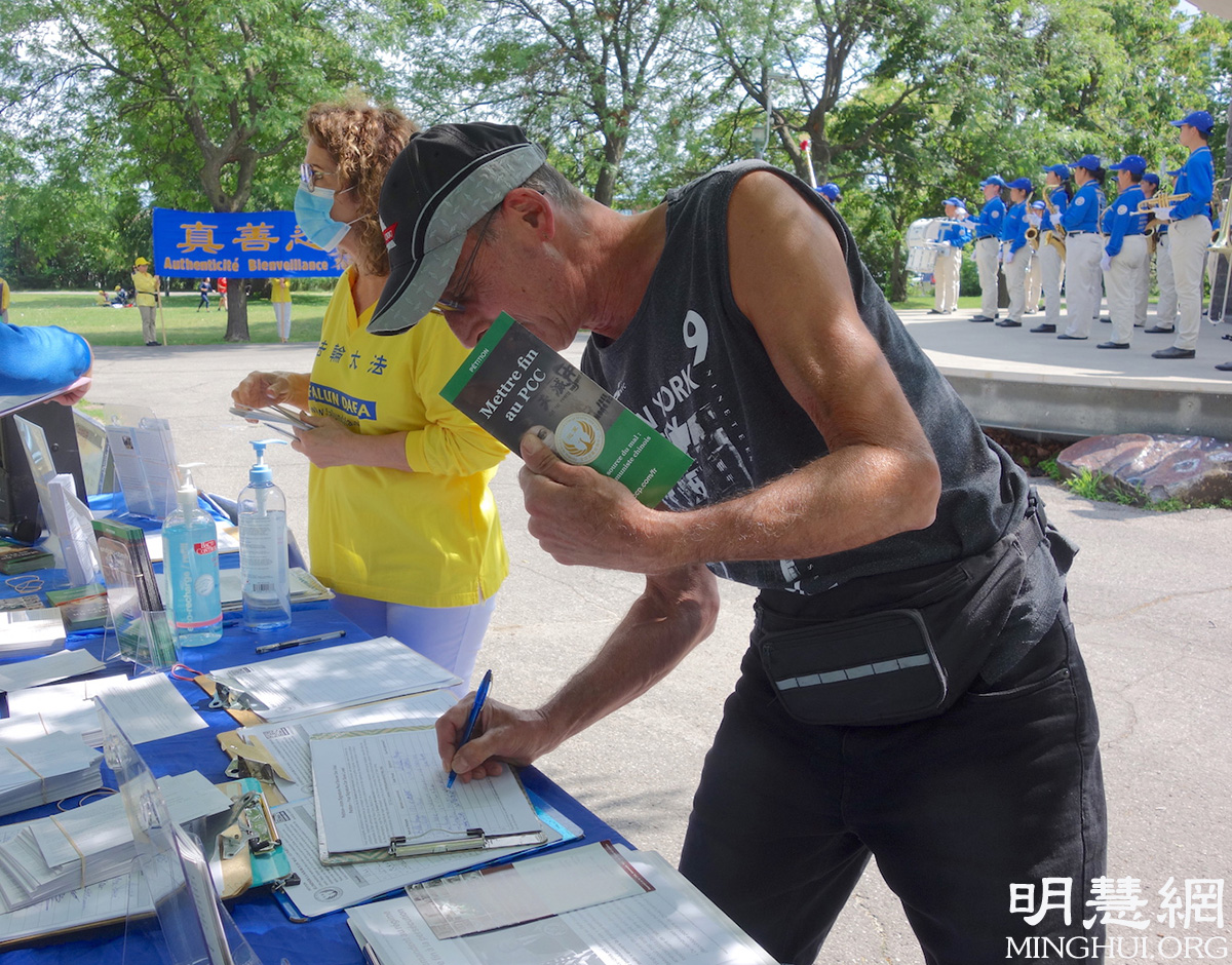 市民圣玛勒先生(Ste-Marie)和圣文洁女士(St-Onge)表示,从天国乐团的演奏和打坐炼功的场景,他们感受到非常多的、非常美好的能量,内心很感动。令人悲伤的是,中共竟然活摘法轮功学员器官的罪行。他们在反迫害徵签上签了字,在临告别时,一再感谢法轮功学员带来了美好。