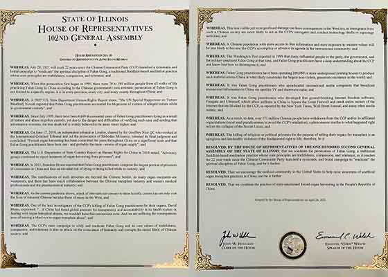 伊利诺伊州众议通过了决议案,“强烈谴责中共对法轮功的迫害”,“谴责中共在中国进行的国家支持的活摘器官的行径。”