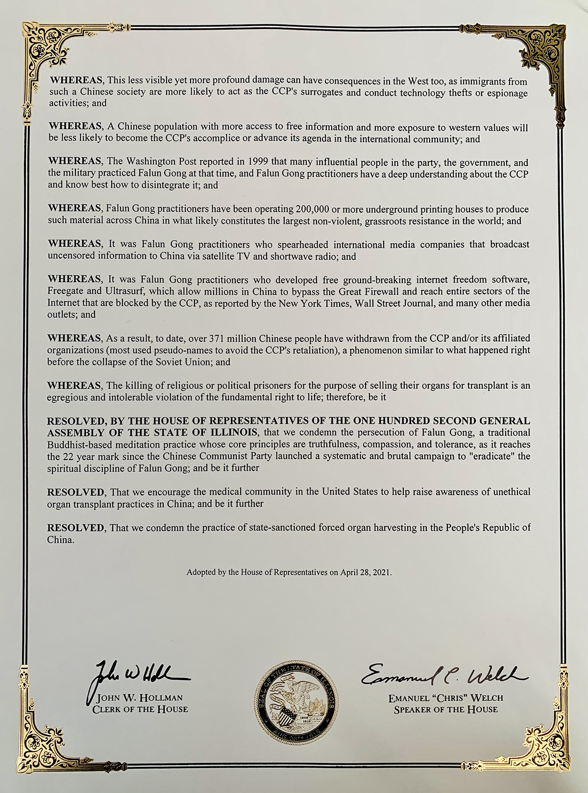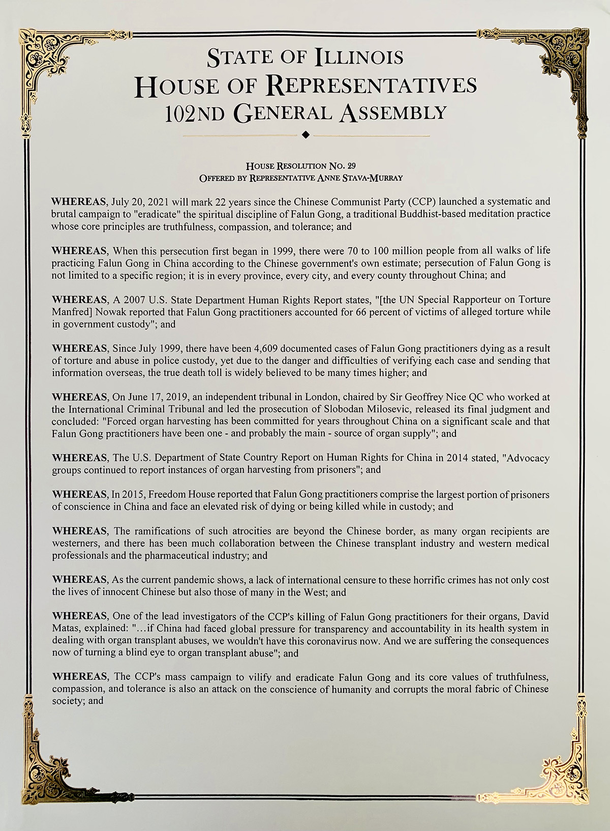 由伊利诺伊州众议院第102届议会决议,在中共发起旨在消灭法轮功的全国性的严重迫害的22周年之际,我们强烈谴责对法轮功的迫害。法轮功是以“真、善、忍”价值为核心,融合了打坐炼习的精神修炼功法;