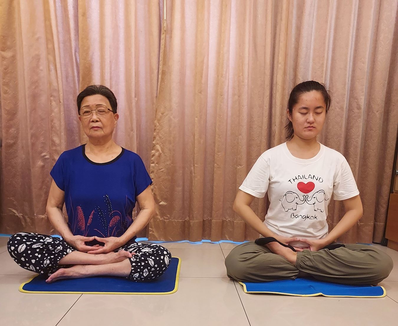 ![]() 梁琼予(右)和奶奶一起打坐 |