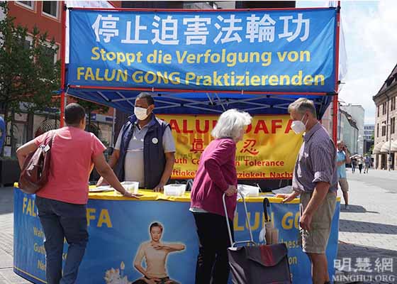七月三十一日,纽伦堡市哈尔广场上传来一阵阵悠扬、悦耳的音乐,这是法轮功学员们在举办信息日及反迫害征签活动。