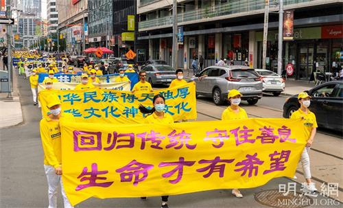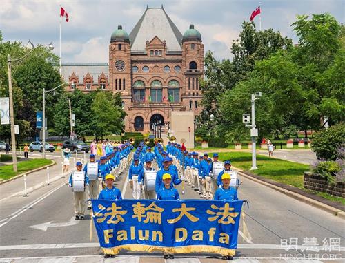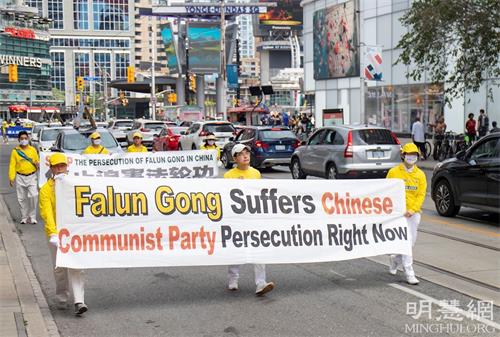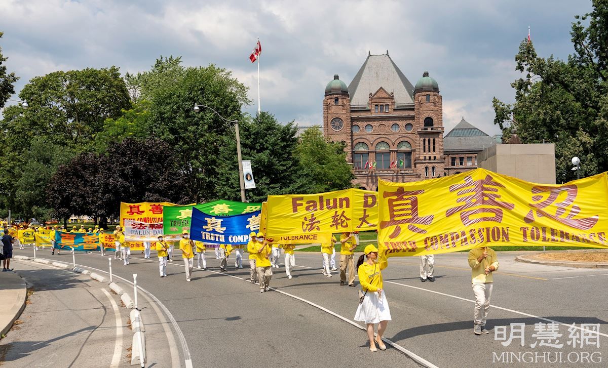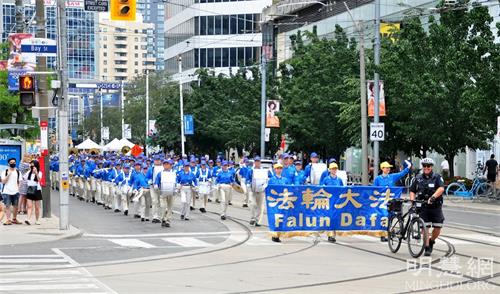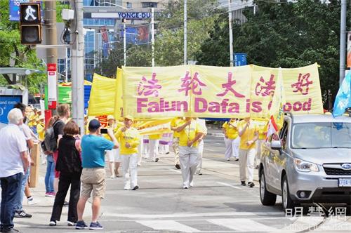 游行队伍从安大略省府大楼前的皇后公园(Queens Park)出发,由天国乐团打头阵,经市中心和唐人街,历时近两个小时。沿途吸引了很多观众录像和拍照;有司机鸣笛表示支持,有民众签名支持反迫害,还有人咨询哪里可以找到炼功点。一位司机把手伸出车窗外,竖起大拇指沿着游行队伍从头到尾欢呼着:“Falun Dafa is good!(法轮大法好!)”