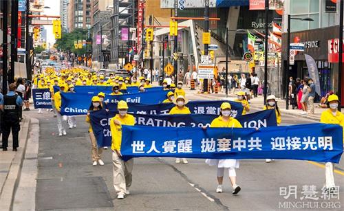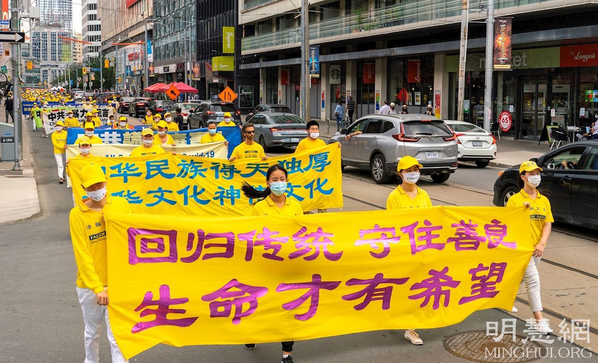 【明慧网二零二一年八月二十四日】(明慧多伦多记者站报道)二零二一年八月二十二日,加拿大多伦多法轮功学员在市区举行了主题为“世人觉醒 抛弃中共 迎接光明”的大游行,民众感谢法轮功学员在疫情仍然蔓延的特殊时期给人们带来美好,同时谴责中共对法轮功学员的残暴镇压。