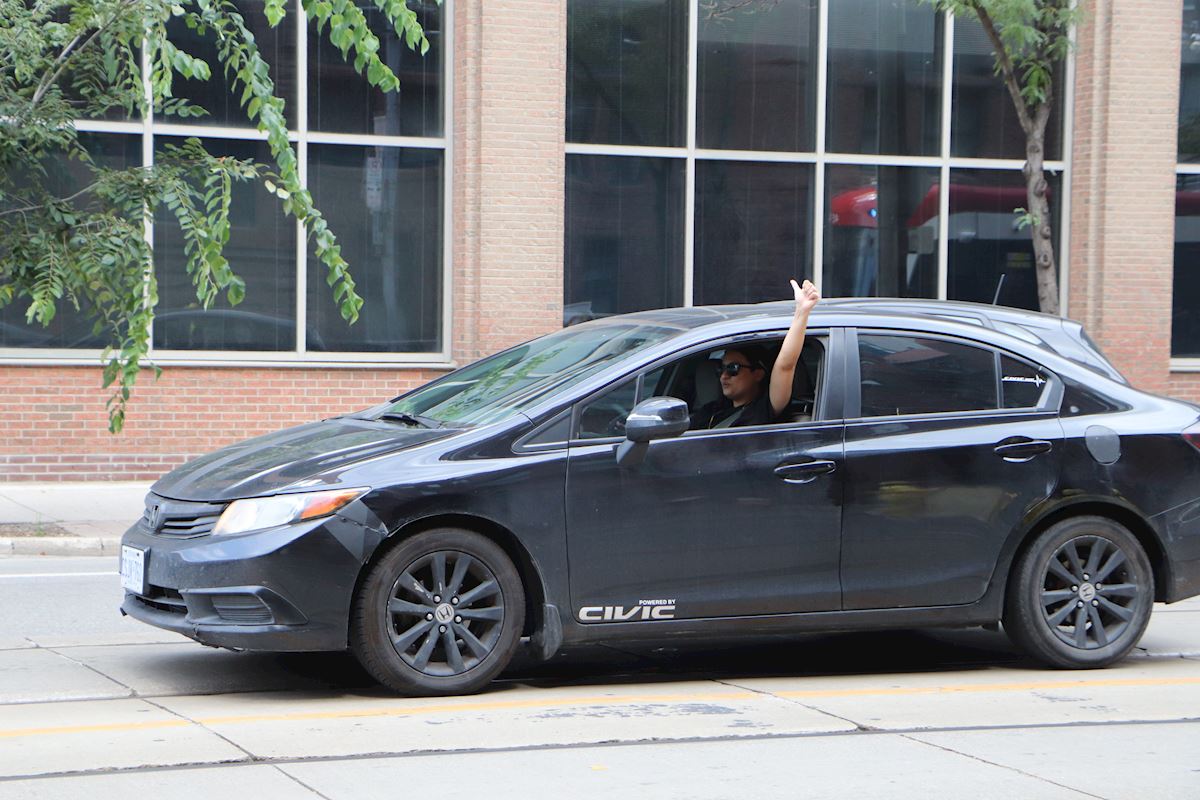 图11:一位司机把手伸出车窗外,竖起大拇指沿着游行队伍从头到尾欢呼着:“Falun Dafa is good!(法轮大法好!)”